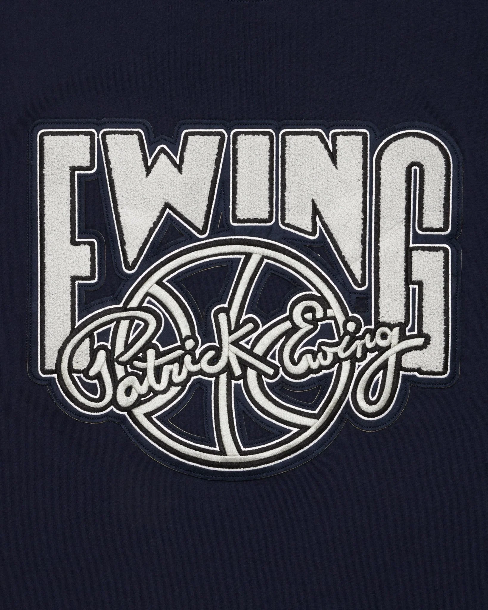 The Heavyweight Ewing Logo T-Shirt in Grey/Navy features a durable embroidered Patrick Ewing chest graphic as well as his iconic number 33 stitched on the back neck.